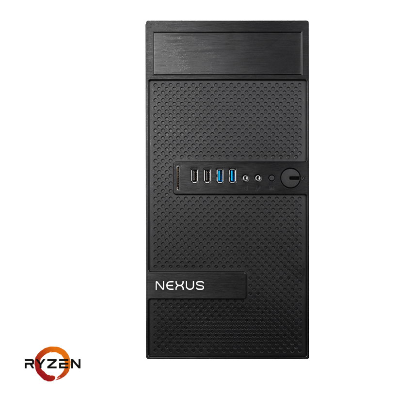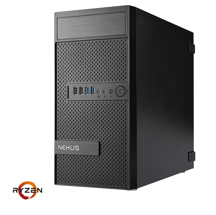 Desktop NEXUS Prime MT, com chassis micro-ATX, suporte para processadores AMD Ryzen.